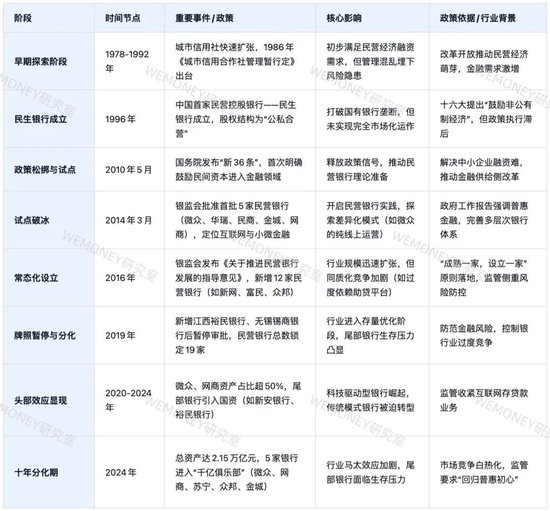 民营银行的早期探索可以追溯到上个世纪。1996年民生银行成立,虽未被官方归类为民营银行,但开创民资控股先河;2003年后渤海银行、浙商银行等混合所有制银行陆续出现。