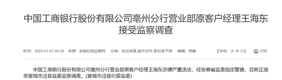 根据安徽纪检监察网2025年1月7日发布的消息,工商银行安徽亳州分行营业部原客户经理王海东涉嫌严重违法,经安徽省监委指定管辖,目前正接受宣城市泾县监委监察调查。