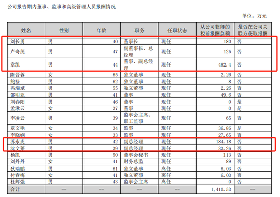 仁东控股的董事、监事、高级管理人员 2024 年度在公司领取的报酬总额为 1410.53万元,其中,董事长刘长勇的年薪为180万元,副董事长、总经理卢奇茂的年薪为125万元,董事、副总经理章凯的年薪最高为482.4万元,另外两位副总经理苏永炎、沈文莱的年薪分别为184.18万元、33.26万元,差距近150万元,财务总监刘丹丹的年薪为89万元。公司内部高管薪酬差距较大,可能与不同岗位的职责、业绩贡献等因素相关。