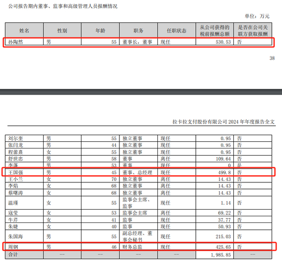 拉卡拉董事、监事、高级管理人员2024年度在公司领取的税前报酬总额为1985.85万元人民币。其中,拉卡拉董事长孙陶然年薪530.53万元,总经理王国强年薪499.8万元,财务总监周钢年薪425.65万元,高管薪酬水平处于行业中等偏上位置。