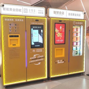 从外表看,黄金ATM的确与银行ATM大小相似。不过,与银行ATM存取款等业务集于一台设备不同,黄金ATM是更形象的说法,其“大名”应是智慧金店,由两台通体金黄的智能终端设备组成,分别用于智能黄金回收、自助黄金购买业务。同时,现场配备1名—2名工作人员。