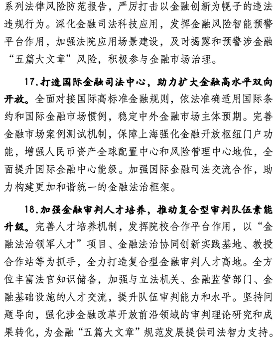 在配套保障方面,《若干意见》强调要完善金融审判执行机制,在支持临时仲裁、建设专项团队、加强执行协同等方面重点发力,打造国际金融纠纷解决优选地;要凝聚金融市场治理合力,通过定期发布涉金融“五篇大文章”典型案例及系列法律风险防范报告等举措,平衡金融守正创新和风险防范;要打造国际金融司法中心,提供更加公正、高效、便捷、可预期的司法服务,助力金融高水平双向开放;要加强金融审判人才培养,全力打造复合型金融审判人才高地。