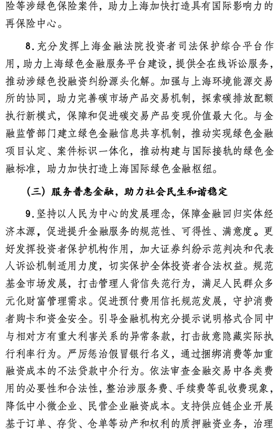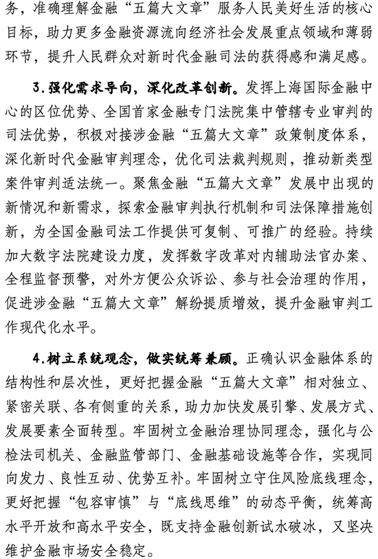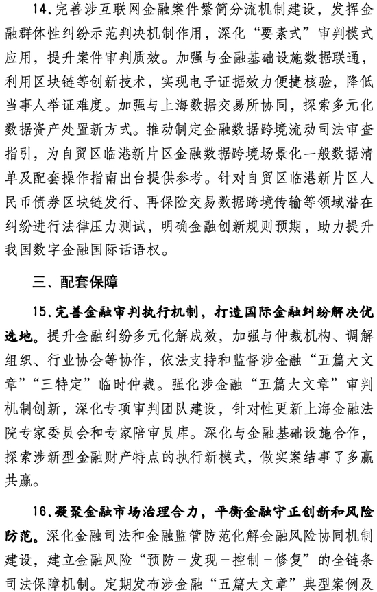 三是提升司法保障新能级。《若干意见》明确,上海金融法院将针对金融“五篇大文章”发展的新特点和新需求,创新和优化系列司法保障机制。