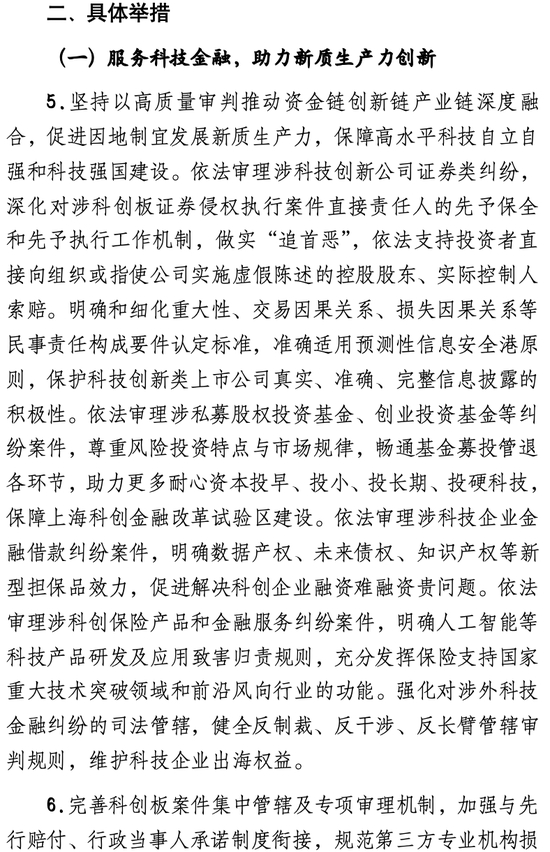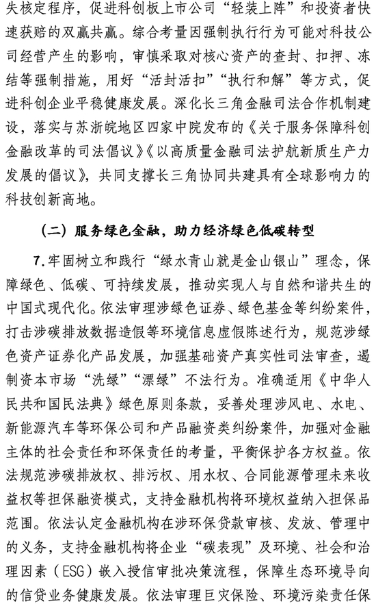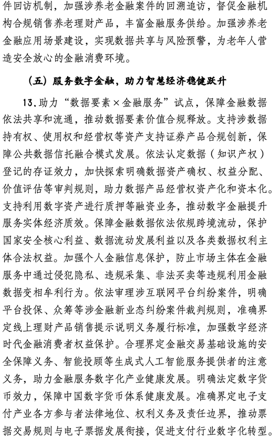 在具体举措方面,《若干意见》分别针对科技金融、绿色金融、普惠金融、养老金融、数字金融,明确“审判理念”及“保障机制”两部分具体内容,共提出35类涉金融“五篇大文章”新类型纠纷案件的裁判理念和规则,21项具体可行的金融司法保障机制,为金融深化改革提供全方位司法支撑。