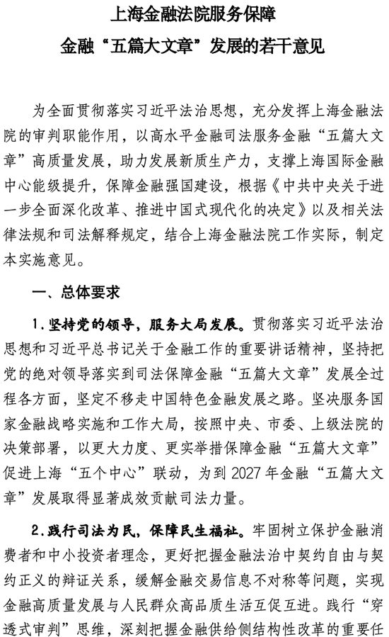 《若干意见》分为总体要求、具体举措、配套保障三大部分,共计18条。总体要求有四个方面:一是坚持党的领导,服务大局发展。以更大力度、更实举措保障金融“五篇大文章”促进上海“五个中心”联动,为到2027年金融“五篇大文章”发展取得显著成效贡献司法力量。二是践行司法为民,保障民生福祉。牢固树立保护金融消费者和中小投资者理念,践行“穿透式审判”思维,实现金融高质量发展与人民群众高品质生活互促互进。三是强化需求导向,深化改革创新。聚焦新情况和新需求,践行新时代金融审判理念,探索金融审判执行机制创新,为全国金融司法工作提供可复制、可推广的经验。四是树立系统观念,做实统筹兼顾。更好把握金融“五篇大文章”相对独立、紧密关联、各有侧重的关系,强化金融司法和监管良性互动、优势互补,助力加快发展引擎、发展方式、发展要素全面转型。