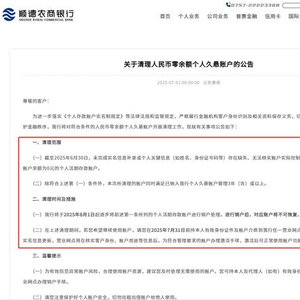 7月1日,顺德农商行发布《关于清理人民币零余额个人久悬账户的公告》称,为进一步落实《个人存款账户实名制规定》等法律法规和监管规定,严格履行金融机构客户身份识别及相关资料保存义务,切实保障客户资金安全,维护金融秩序,该行将对符合条件的人民币零余额个人久悬账户开展清理工作。