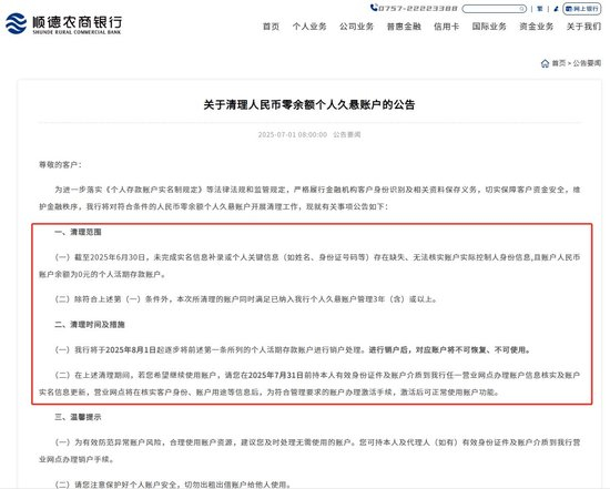 其中,顺德农商行公告,本次清理范围为:(一)截至2025年6月30日,未完成实名信息补录或个人关键信息(如姓名、身份证号码等)存在缺失、无法核实账户实际控制人身份信息,且账户人民币账户余额为0元的个人活期存款账户;除符合上述第(一)条件外,本次所清理的账户同时满足已纳入该行个人久悬账户管理3年(含)或以上。