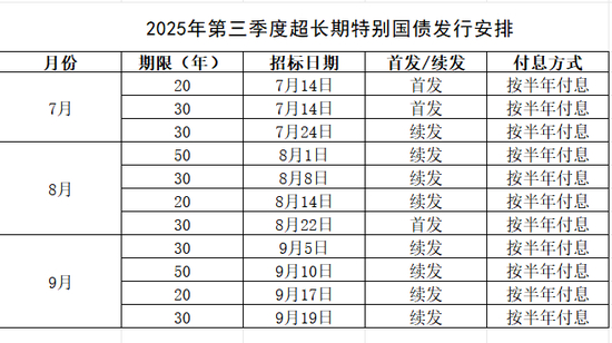 7月1日,财政部公布2025年第三季度国债发行安排。根据安排,三季度将共计发行11只超长期特别国债。其中4只提前10天左右发放。