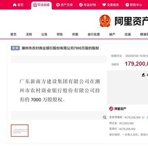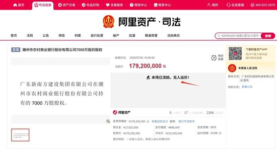 7月2日,阿里拍卖平台显示,广东新南方持有的潮州农商行的7000万股股权进入变卖环节,因无人出价而第三次遭遇流拍。