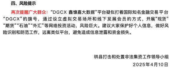 2025年1月,宜宾市叙州区财政局就发布了风险提示称,该区存在以线上线下方式宣传“DGCX”交易所投资的行为,涉嫌开展违法金融活动。4月,宜宾市珙县打击和处置非法集资工作领导小组再次发布风险提示,明确指出“DGCX鑫慷嘉”盗用DGCX名义,疑似开展传销活动。
