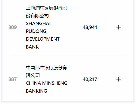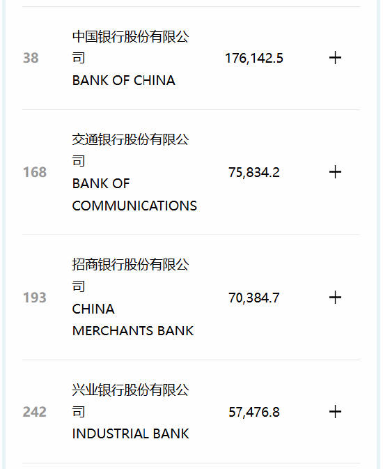 中国上榜的银行机构包括中国工商银行(第26位)、中国农业银行(第30位)、中国建设银行(第31位)、中国银行(第38位)、交通银行(第168位)、招商银行(第193位)、兴业银行(第242位)、上海浦东发展银行(第309位)、中国民生银行(第387位)9家。这些机构业务覆盖广泛,综合实力在全球银行业中占据重要地位。