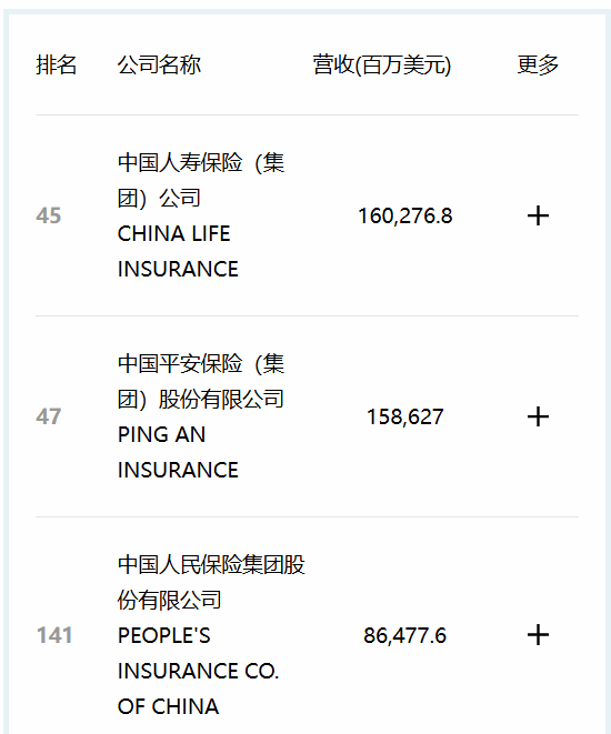 保险领域,中国人寿保险(集团)公司(第45位)、中国平安保险(集团)股份有限公司(第47位)、中国人民保险集团股份有限公司(第141位)、中国太平洋保险(集团)股份有限公司(第251位)、泰康保险集团股份有限公司(第334位)、友邦保险控股有限公司(第417位)、新华人寿保险股份有限公司(第498位)7家中国保险机构上榜。