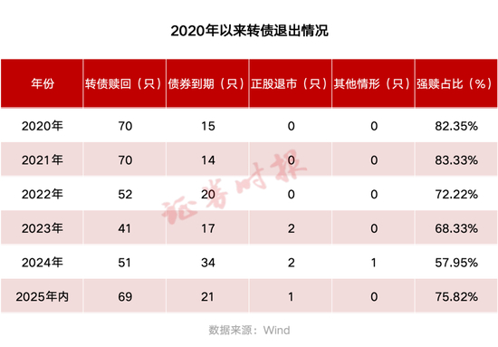 其中,69只转债因触发强赎条款,陆续被上市公司强制赎回。2024年,在A股市场行情低迷的情况下,强赎占比回落至57.95%;今年以来,A股市场表现较强,上市公司触发强赎的概率提升,截至目前的强赎占比达75.82%。