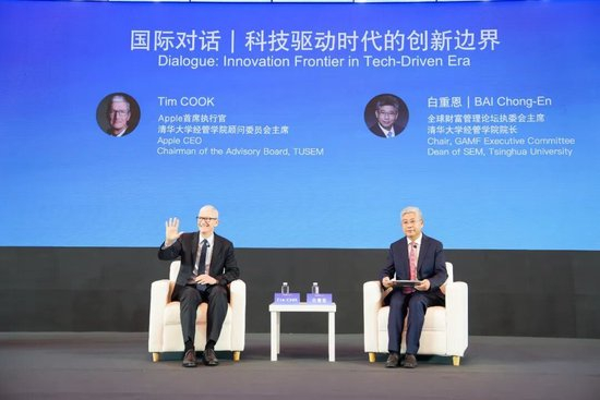 在国际对话环节,Apple 首席执行官、清华大学经管学院顾问委员会主席Tim Cook与全球财富管理论坛执委会主席、清华大学经管学院院长白重恩展开对话。本场国际对话以“科技驱动时代的创新边界”为核心主题,双方围绕人工智能和技术创新的融合路径进行深度交流。
