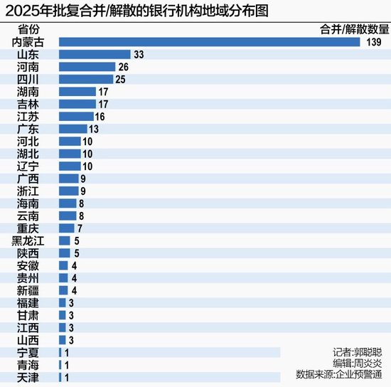 从地域看,内蒙古以一次性整合139家机构居首,山东(33家)、河南(26家)、四川(25家)等地紧随其后。