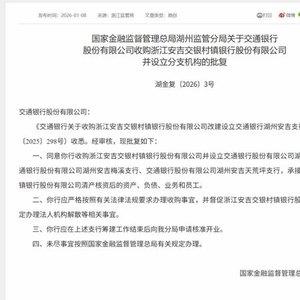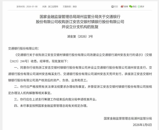 1月6日,金融监管总局湖州监管分局下发批复,同意交通银行收购浙江安吉交银村镇银行,并设立交行湖州安吉支行、交行湖州安吉梅溪支行、交行湖州安吉天荒坪支行,承接浙江安吉交银村镇银行清产核资后的资产、负债、业务和员工。