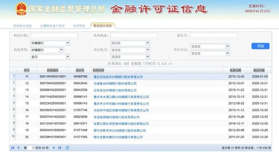 根据金融监管总局公布的金融许可证信息,2010年以来共有430家村镇银行进入“机构退出列表”,其中,2025年全年就有310家村镇银行退出市场,占历史总量的70%以上;2026年1月以来,已有超10家村镇银行新增纳入退出列表。