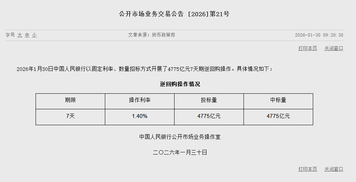 1月30日金融一线消息,2026年1月30日中国人民银行以固定利率、数量招标方式开展了4775亿元7天期逆回购操作。