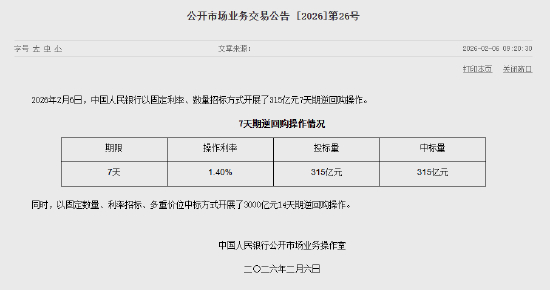 2月6日金融一线消息,央行今日开展315亿元7天逆回购操作,操作利率为1.40%。同时,以固定数量、利率招标、多重价位中标方式开展了3000亿元14天期逆回购操作。因今日有4775亿元7天期逆回购到期,实现净回笼1460亿元。