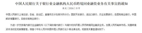 近日,《中国人民银行关于银行业金融机构人民币跨境同业融资业务有关事宜的通知》(银发〔2026〕51号)(下简称《通知》)发布。