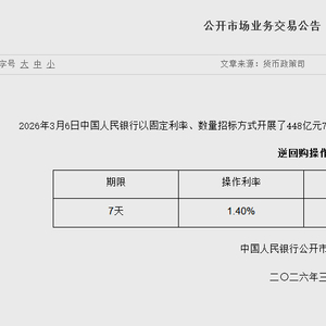 3月6日金融一线消息,据央行官网,2026年3月6日中国人民银行以固定利率、数量招标方式开展了448亿元7天期逆回购操作。