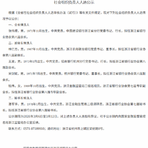 3月9日金融一线消息,浙江金融监管局发布社会组织负责人人选公示显示,中国建设银行浙江省分行党委书记、行长张伟煜,拟任浙江省银行业协会第八届会长。