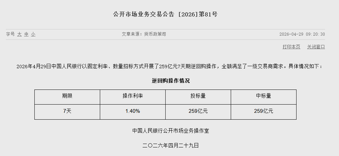 央行今日开展259亿元7天期逆回购操作 金融一线 04.2909:38 关注 4月29日金融一线消息,据央行公告,2026年4月29日中国人民银行以固定利率、数量招标方式开展了259亿元7天期逆回购操作,全额满足了一级交易商需求。