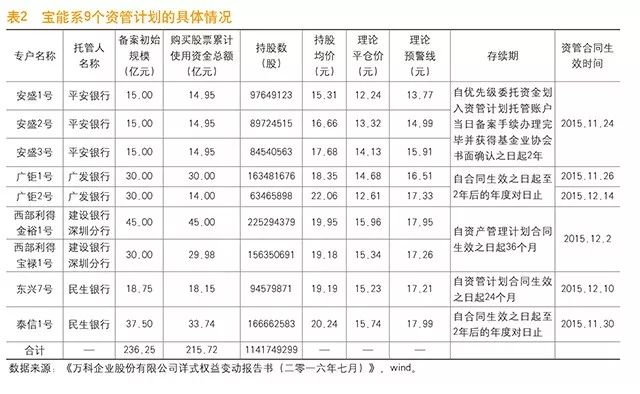 截至2017年6月30日,“宝能系”通过钜盛华及其一致行动人前海人寿,累计持有万科股份28.04亿股,占万科总股本的25.4%。其中,钜盛华直接持股9.29亿股,占万科总股本的8.33%,通过9个资管计划持股11.42亿股,占万科总股本的10.41%,共持有万科股份20.71亿股,占比18.74%,耗资约为345.22亿元;前海人寿分别通过自有资金和保险资金(两款万能险)买入1.68亿股和5.68亿股,共持有7.36亿股万科股票,占比6.66%,耗资约105.14亿元。