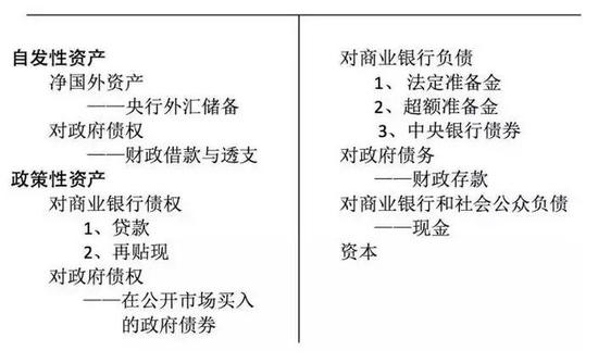 在央行资产中,根据与货币政策操作目标的联系而区分自发性资产和政策性资产。 自发性资产指不为央行所控制,或虽为央行控制但交易目的并非货币政策目标的资产;政策性资产指央行为实现货币政策目标而交易的资产。考虑到由于购买外汇的目的通常是稳定汇率,而非投放流动性,因此央行外汇储备被列入自发性资产。央行实现货币政策目标而投放流动性要通过增加政策性资产。在政策性资产项下,央行投放流动性有增加对商业银行债权和增加对政府债权两种方式。当央行投放短期流动性时,通常采用在债券回购协议下临时买入国债的方式,这种方式本质上属于增加对商业银行债权,相当于国债抵押融资,但各国对债券回购协议的法律规定不同,在债券回购协议带有两次买卖法律特征的国家,央行在债券回购协议项下临时买入债券也可视作增加对政府债权。