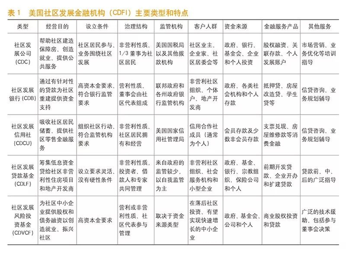 经过几十年的发展扩张,美国社区发展金融机构已经发展成熟,业态呈现多样化趋势。目前,最主要的社区发展金融机构类型有五种:社区发展公司、社区发展银行、社区发展信用社、社区发展贷款基金和社区发展风险投资基金。其主要特点见表1。