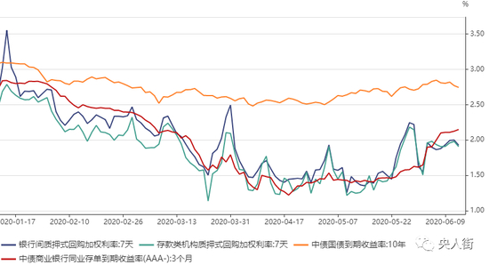 2、DR007、国债到期收益率均有所下行。6月12日,FDR007、DR007和10年国债到期收益率分别为1.9%、1.91%和2.75%,分别比上周6月4日下降10、7和8个BP。