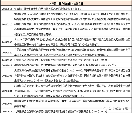 2020年6月12日北京银保监局发布《关于结构性存款业务风险提示的通知》(京银保监发〔2020〕320号),对结构性存款业务从严控业务总量及增速(增长过快的银行要逐月压降)、确保产品设计审慎合规、加强资金来源甄别(防空转套利)、切实规范宣传销售行为等几个维度进行规范约束。