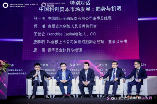 中国国际金融股份有限公司董事总经理张一鸣,康桥资本创始人及首席执行官傅唯,神州细胞副总裁、董事会秘书唐黎,Franchise Capital创始人、CIO王世宏,银华基金执行总经理唐能出席“2020中国-阿联酋创新投资大会”,并就“中国科创资本市场发展:趋势与机遇”话题发表洞见。