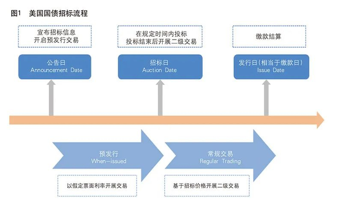 美国国债招标流程分为公告、投标、发行和缴款三个环节(见图1)。公告环节宣布招标信息并开启预发行交易。自公告日至招标日,合格机构投资者可在场外市场就即将发行的债券以假定的票面利率开展交易(不需要保证金或物),并只能在发行日(缴款日)进行实物交割。在投标环节,竞争性投标者对数量、利率或价格等要素进行投标,非竞争性投标者就数量要素同时进行投标,非竞争性投标先截标。投标结束后,财政部优先满足符合规则的非竞争性投标者需求,再对竞争性投标进行募入,直至达到发行规模。所有中标者按照同一利率或价格买入美国国债。招标结束后国债即可上市,合格机构投资者可基于招标价格开展正常的二级交易,但交割是在发行日(即缴款日)之后。由于自公告日起便可开展交易,因此美国国债可实现全周期交易,对缴款上市无具体区分。美国国债的发行日相当于我国的缴款日,券款交割采用券款对付(DVP)方式结算。