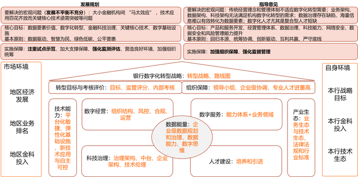 就银行业而言,数字化转型不只是单个机构的转型,而是全行业为适应数字经济发展要求进行的整体转型,这一点在人民银行和银保监会近期发布的两份指导性文件中都有明确提及。本文尝试按照架构设计的思维理念对二者进行“先解构,再结构”的综合比对(见图2)。