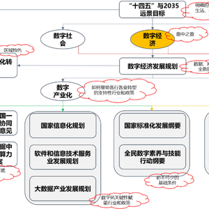 《纲要》中提出要“加快建设数字经济、数字社会、数字政府”,而数字经济是重中之重;2021年12月,国务院印发的《“十四五”数字经济发展规划》对这一发展方向进行了权威阐述。数字经济被解释为“继农业经济、工业经济之后的主要经济形态,是以数据资源为关键要素,以现代信息网络为主要载体,以信息通信技术融合应用、全要素数字化转型为重要推动力,促进公平与效率更加统一的新经济形态”。以这两个顶层设计文件为核心,各地各行业纷纷出台了一系列更具有区域和行业特色的贯彻实施方案,从而构成了从中央到地方的数字化转型蓝图。