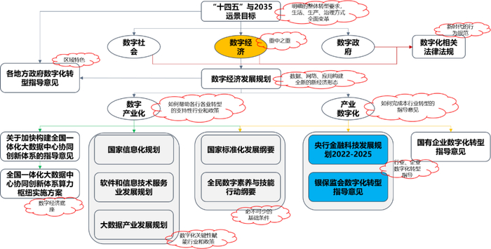2021年3月,国家正式发布了《中华人民共和国国民经济和社会发展第十四个五年规划和2035年远景目标纲要》(以下简称《纲要》)。该文件详细阐述了未来5~15年的国民经济发展的愿景和措施,其中包括数字化转型的内涵及各项要求。以此文件为纲领,相关行业逐渐形成了数字化转型的纲领性文件体系(见图1)。