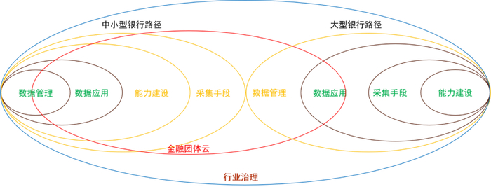 数据能力的建设大致可以分为采集手段、能力建设、数据管理和数据应用四个方面。不同银行由于起点不一样,路径也会有所差别。本文简单按照大型银行(包含一些数据能力已经比较强的中型银行)和中小型银行划分为两大类,对其数据能力建设路径分别阐述下。当然,所有路径都不是单一线性的,它们体现的是不同阶段各个机构数据能力建设的侧重点。