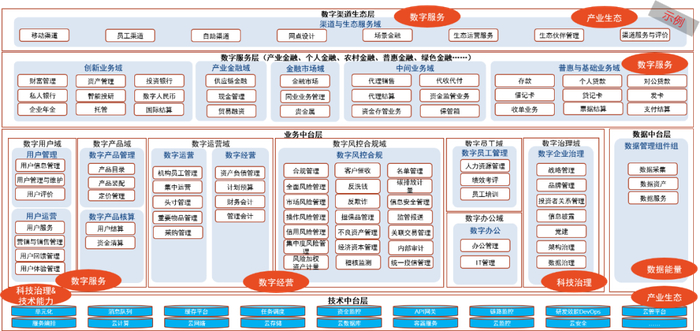 无论企业架构还是中台架构设计都不适合简单照搬,企业应结合自己实际需要进行设计。由于没有统一的行业标准设计样本,根据人民银行和银保监会的两份文件,结合行业的具体实践,笔者制作下图供大家参考(见图7)。