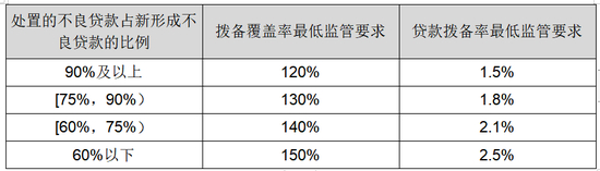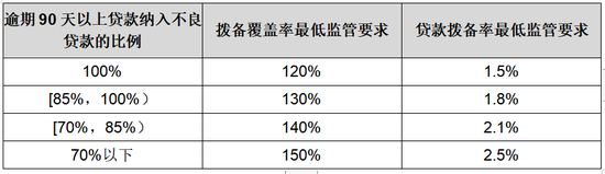 贷款拨备率基本标准为2.5%,拨备覆盖率基本标准为150%。实际执行中,两项标准中的较高者为商业银行贷款损失准备的监管标准。