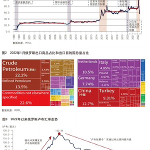 总的来看,影响卢布汇率的主要因素有三个层面。一是国际收支因素。贸易顺差是卢布汇率的关键支撑。俄罗斯货物贸易保持常态化顺差,是国民收入的主要来源。原油、煤炭天然气等能源出口占比超40%,主要出口至欧洲和亚洲市场。二是国际因素。美联储货币政策和大宗商品价格对卢布汇率影响显著。卢布历次贬值时期中的三次都伴随着美联储加息。此外,国际油价在克里米亚问题和本次俄乌冲突期间的大跌和大涨对卢布汇率的短期影响也是决定性的。三是制裁影响。在俄罗斯频繁受到西方国家制裁的历史上,卢布汇率的短期贬值几乎是必然结果。一些研究甚至将卢布汇率走势作为俄罗斯经济受到制裁的状态指标之一。
