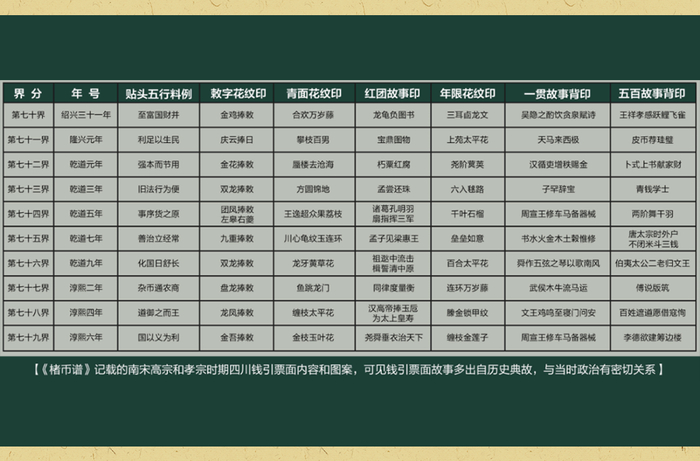 因纸币极难保存,目前还未发现宋代纸币实物,但是我们可以在同期历史文献中发现大量与纸币有关的记载。比如《楮币谱》中就记载了南宋高宗和孝宗时期四川钱引的票面内容和图案,这些内容多出自历史典故,且与当时的政治有着密切联系。