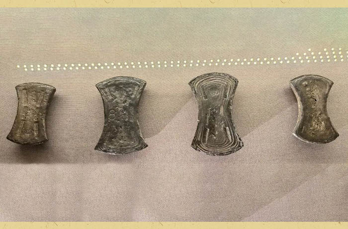 南宋银铤(中间两枚重二十五两,左右重十二两半,中国钱币博物馆藏)