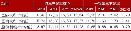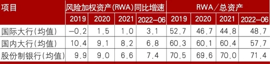 三是中外银行资产增长错位,国际银行“轻资产、轻资本”,风险加权资产增速相对较低;国内银行“重资产、重资本”,风险加权资产增速相对较高。疫情对欧美经济冲击较大,加上高波动的金融市场环境,国际大行经营策略趋于谨慎,资产端减少面向实体经济的贷款投放(特别是零售贷款),增加债券等金融资产配置,资产组合呈现“低风险、高流动性”特征。2019—2021年,国际银行的总资产年均增长9%,但风险加权资产年均增长仅为0.8%;2022年以来,欧美经济增长过热,通胀高企,融资需求旺盛,国际银行风险加权资产增长加快,上半年总资产、风险加权资产分别同比增长1.7%和3.1%。从风险资产占比看,国际银行的RWA/总资产比例为47%,较2019年下降5.7个百分点;从资产组合看,国际银行的贷款、金融投资占比分别为34%和35%,贷款占比较2019年下降7.4个百分点。对比之下,国内银行资产增速稳中有降,国有大行增长快于股份制银行,但股份制银行“重资产、重资本”特征更明显。近四年,国内大行的总资产、风险加权资产的年均增速分别为8.5%和8.8%,分别高于股份制银行0.3和0.9个百分点。2022年6月末,国内大行的RWA/总资产比例为57.7%,较2019年下降1.6个百分点;股份制银行的RWA/总资产比例为71.4%,较2019年微升0.7个百分点。从资产组合看,国内大行平均贷款占比为58.3%,高于股份制银行0.2个百分点,较2019年上升2.7个百分点。(见表3)