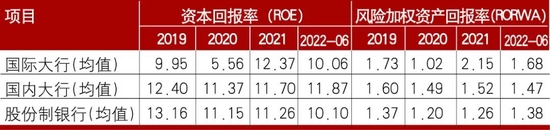 五是中外银行资本效益错位,国际银行资本回报和资本充足率“双降”,国内银行资本回报和资本充足率“一降一升”。近四年,国际银行的资本回报和资本充足率波动较大,特别是2022年以来盈利大幅下降,核心指标下降较多。截至2022年6月末,国际银行平均资本回报率(ROE)为10.06%,较年初下降2.31个百分点,较2019年上升0.11个百分点;风险加权资产回报率(RORWA)为1.68%,较年初下降0.42个百分点,较2019年下降0.05个百分点;资本充足率(CAR)为15.64%,较年初下降1.16个百分点,较2019年下降0.76个百分点,主要是核心一级资本充足率下降。对比之下,国内银行的资本回报水平稳中有降,资本充足率稳中有升,国有大行表现好于股份制银行。截至2022年6月末,国内大行的平均资本回报率(ROE)为11.87%,较2019年下降0.53百分点;风险加权资产回报率(RORWA)为1.47%,较2019年下降0.13个百分点;资本充足率为16.57%,较2019年上升0.84个百分点,但核心一级资本充足率下降0.38个百分点。(见表5、表6)