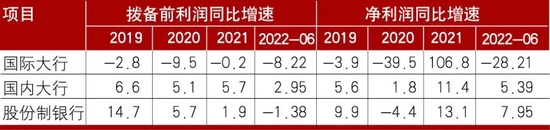 二是中外银行盈利增长错位,国际银行顺周期明显;国内银行核心指标基本平稳,盈利增长中枢下降。2020年,国际银行大量计提拨备,叠加零利率环境净息差收窄,经营业绩承压,拨备前利润下降5%、净利润下降40%。2021年,国际银行盈利实现V型反弹,主要靠减值回拨,推动净利润超过疫情前水平,当年增长107%,但拨备前利润仍下降0.2%。2022年以来,国际银行盈利再次承压,上半年拨备前利润、净利润分别下降8.2%和28.2%,并呈现出“利息收入增、非息收入降、拨备计提多”的特点。在美国加息周期下,净息差的改善带动上半年净利息收入增长12.3%;但国际金融市场大幅波动(股债双降),非息收入下降13.3%;各类风险和挑战增多,拨备计提明显增加。对比之下,国内银行的盈利相对稳健,但增长动能也减弱,国有大行好于股份制银行。2019—2021年国有大行的拨备前利润增幅为5%—7%,净利润增幅为5%—6%,均较为平稳,但2022年上半年拨备前利润增幅仅为3%,较一季度下降近1个百分点,显示盈利增长动能继续减弱,主要是净息差收窄和减费让利力度加大。股份制银行的拨备前利润增长相对更承压,上半年负增长1.4%,但净利润增速相对较好,上半年增幅为8%,主要是资产减值支出下降。(见表2)