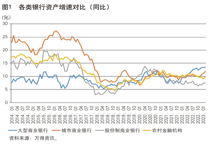 近年来,在服务实体、回归主业的政策导向下,国内各类银行纷纷加大信贷投放力度,特别是在普惠金融、制造业、“三农”等领域。国有大型银行凭借资金成本、信息技术和服务网络优势,重点发力普惠金融等中小银行传统业务领域,在一定程度上对中小银行形成“挤出效应”。统计显示,2022年国有大型银行普惠小微贷款余额8.6万亿元,较2020年增长78%,增速较城商行、农商行分别高29个、42个百分点,国有大型商业银行普惠小微贷款的市场份额从31.7%上升到36.5%,而城商行从14.5%下降到14%,农商行下降更明显,从33.9%下降到29.8%。值得关注的是,2022年交通银行中国银行工商银行新发放普惠小微贷款利率分别为3.75%、3.81%和3.86%,明显低于全国企业贷款加权平均利率4.17%,价格优势明显。同时,在经济快速发展时期,部分中小银行逐渐偏离市场定位,拓展大客户、大项目,原有市场竞争力弱化,在经济下行期市场竞争加剧情况下,发展陷入困境。原银保监会公布数据显示,过去十年间,城商行资产增速一直在各类银行中保持最快,国有大型银行则相对较慢,但2022年开始大型商业银行资产增速明显加快,城商行、农商行的资产增速则明显回落。