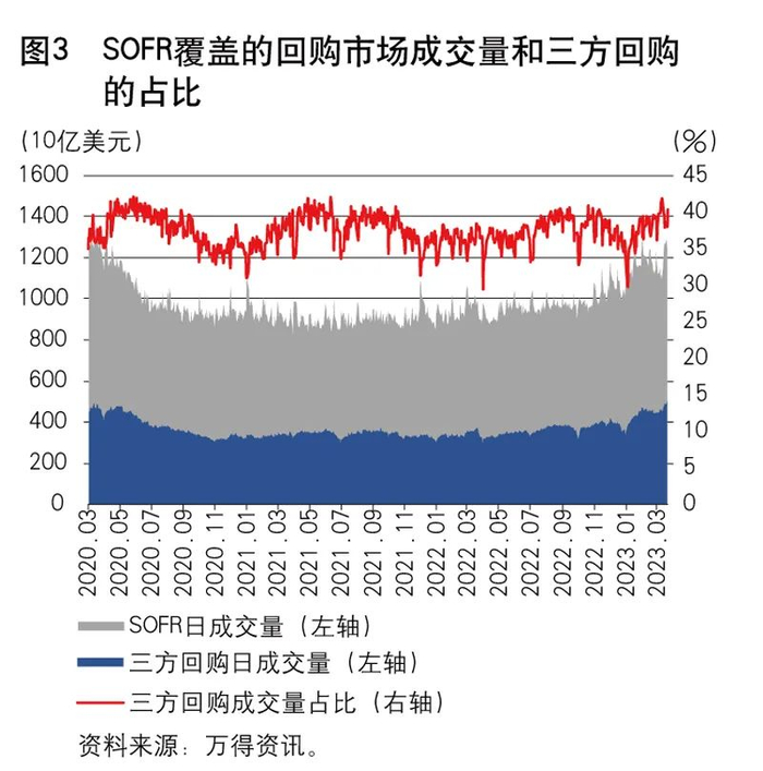 面对安全资产的短缺,提高合格担保品的管理和使用效率成为市场关注的另一个焦点。SOFR涵盖了美国回购市场的三个部分——三方回购、通过固定收益清算公司(FICC)结算的双边回购和通用担保品融资回购,其中三方回购占比40%左右(详见图3)。因此,SOFR替换LIBOR后,三方回购市场将成为影响基准利率变化的重要载体。三方回购的核心机制是由第三方托管机构提供集中、统一的担保品管理服务,提升担保品使用效率,从而提升回购市场的融通效率和价格发现功能。因此,担保品管理作为SOFR市场的核心配套机制,对金融体系的稳定来说至关重要,呈现越来越明显的系统重要性特征。