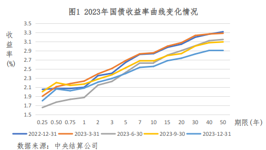 2023年末,1年、3年、5年、7年、10年期国债收益率分别为2.08%、2.29%、2.40%、2.53%、2.56%,分别较2022年末下行2个、11个、24个、29个、28个基点。
