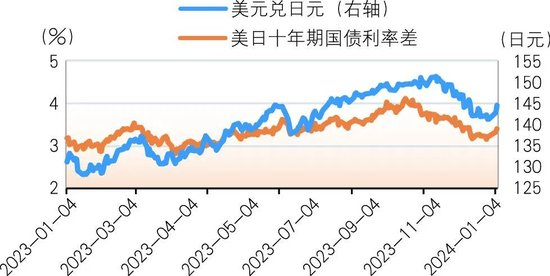 美日国债利差扩大推动日元持续贬值,继续为日本出口企业带来利好。日元兑美元汇率受美日国债利差变动影响明显,在美联储连续加息的影响下,2023年美日国债利差持续扩大,短期资金加速流出日本,推动日元继续贬值,给出口企业带来积极影响。2023年,日元兑美元汇率整体呈现波动贬值态势,从年初1美元兑131日元贬值至年末141日元,贬值幅度达7.67%。在此期间,受美日国债利差迅速扩大影响(2023年11月, 美日国债利差一度达到4.57%),日元兑美元汇率跌至1美元兑151日元的低点,较年初贬值幅度高达15.8% (见图3)。日元持续贬值为推动日本企业出口创造了有利条件。